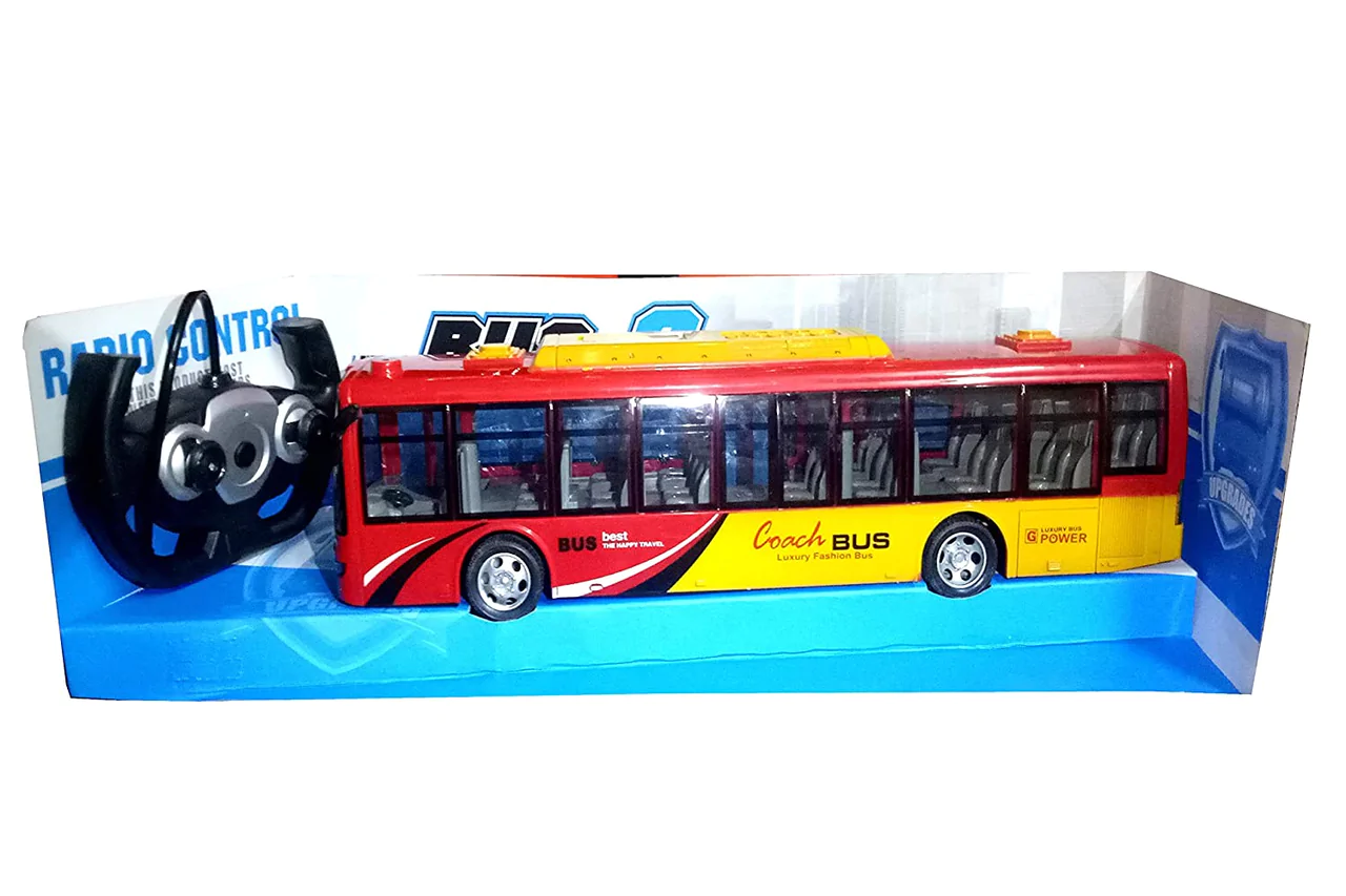 Realistic remote control bus: adjustable front wheel alignment, working led headlights, remote control distance of 30 meters (100 feet).